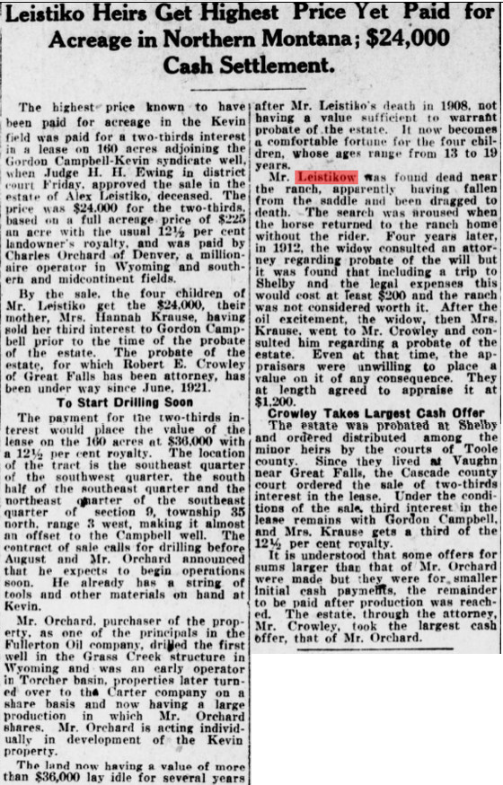 At the time of Alex's death, the 160-acre farm had little value, "insufficient to warrant probate of the estate". Apparently his wife, Hannah, inherited 1/3 interest, and the other 2/3 went to their 4 children. Hannah later sold her 1/3 interest to a neighbor, Gordon Campbell. Oil was then discovered in the area, and the children's 2/3 interest was sold to Charles Orchard of Denver, for the highest price then paid for northern Montana acreage, $225 per acre plus a 12.5% "landowner's royalty" associated with future oil production.